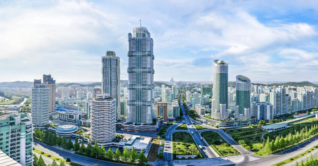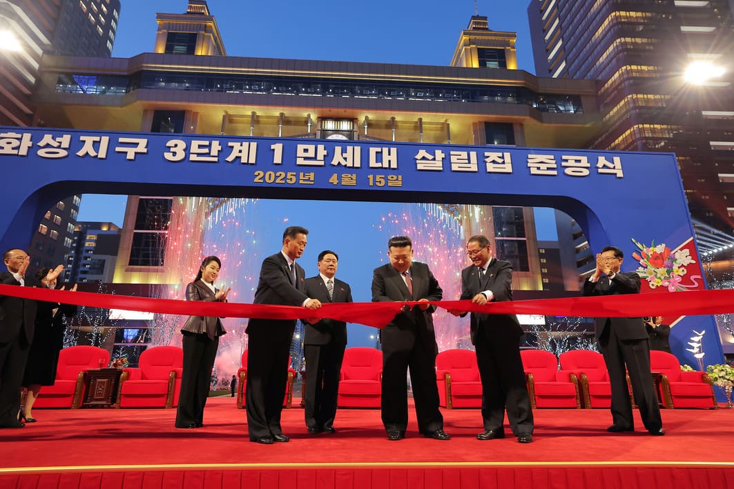 Ким Чен Ын перерезает ленту в честь ввода в строй 3-й очереди жилых домов на 10 тыс. квартир в районе Хвасона. Апрель 2025 года.