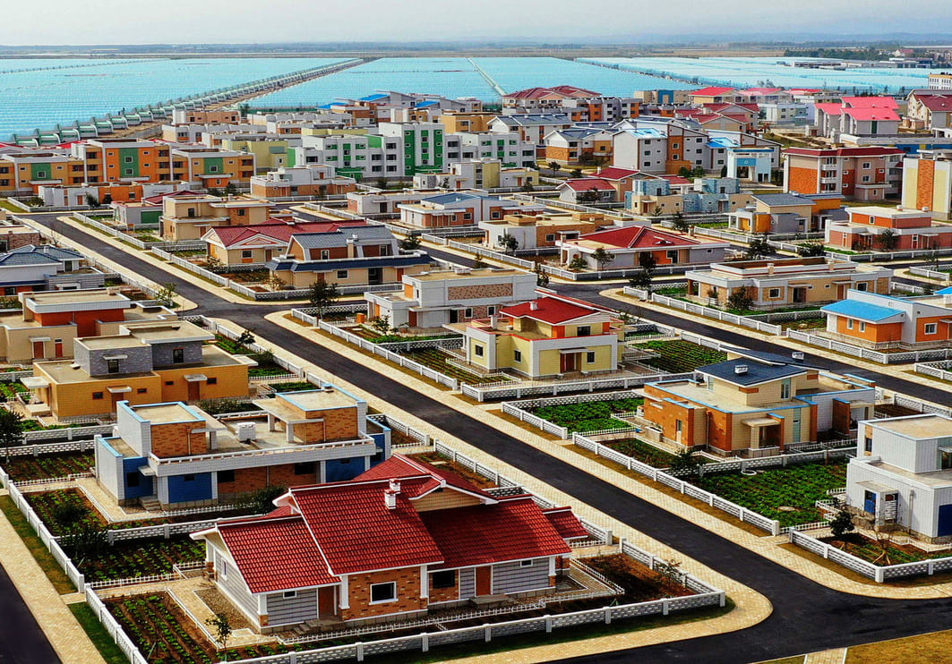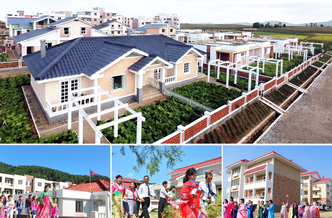 Жилые дома, построенные по плану партии о строительстве деревни, и сельские труженики, справляющие новоселье.