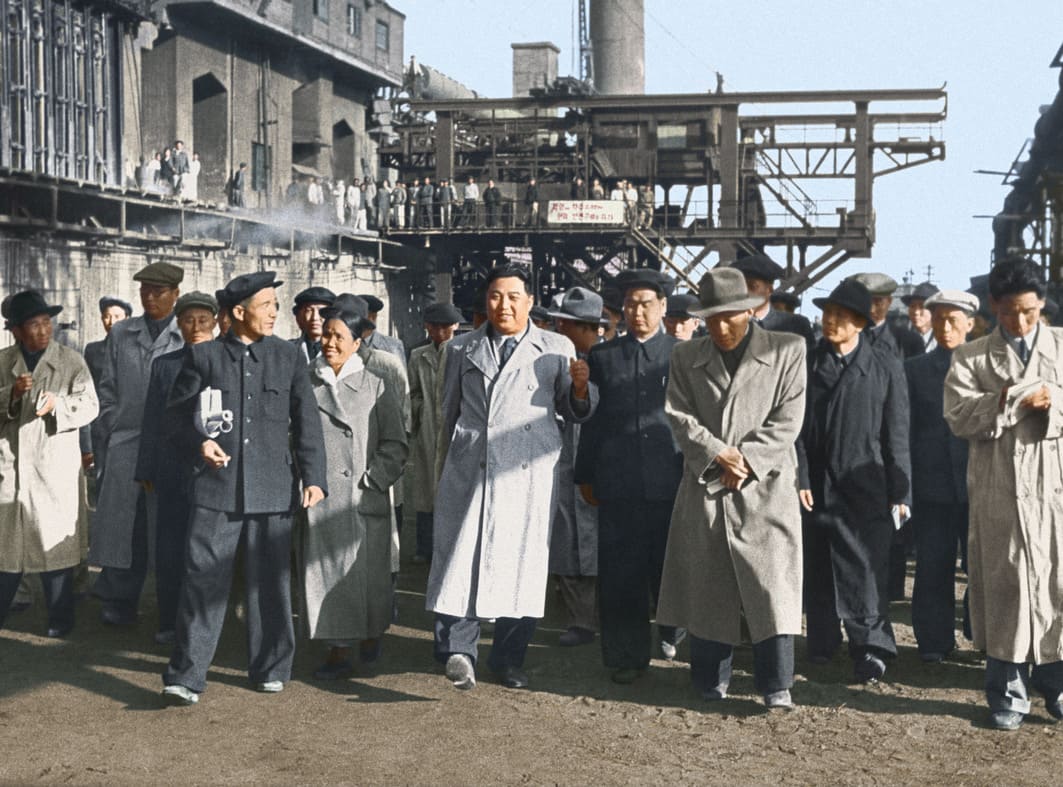 Ким Ир Сен осматривает стройку восстановления доменной печи №2 на Металлургическом заводе им. Ким Чака. Май 1958 года.