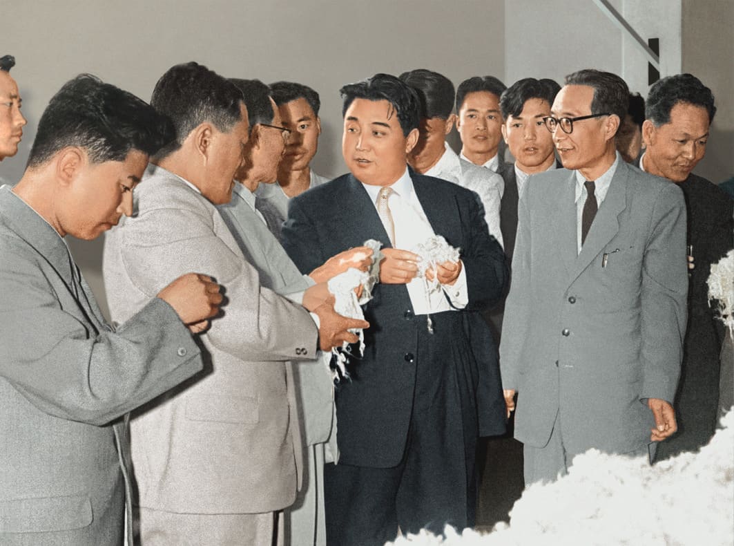 Ким Ир Сен ознакомляется с виналоновой ватой. Октябрь 1961 года.