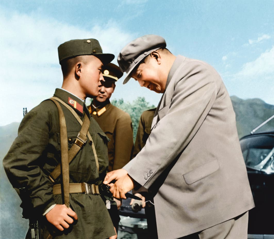 Ким Ир Сен ознакомляется с вооружением солдата Народной Армии. Май 1965 года.