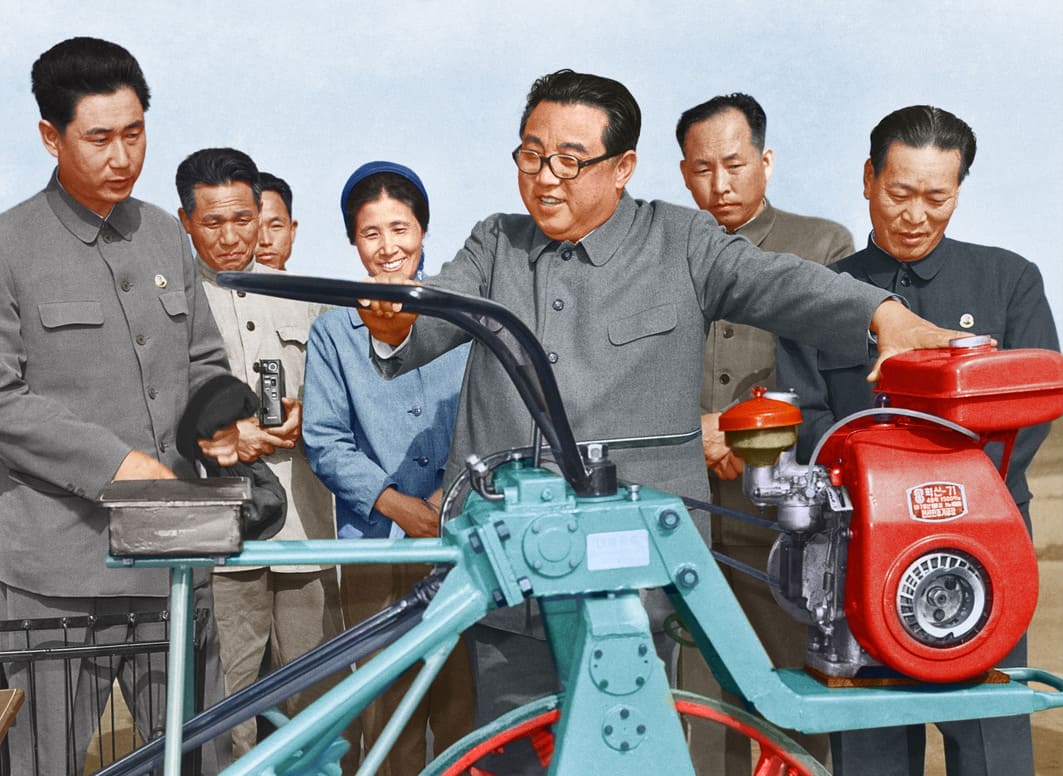 Ким Ир Сен ознакомляется с новой сельскохозяйственной машиной. Май 1974 года.
