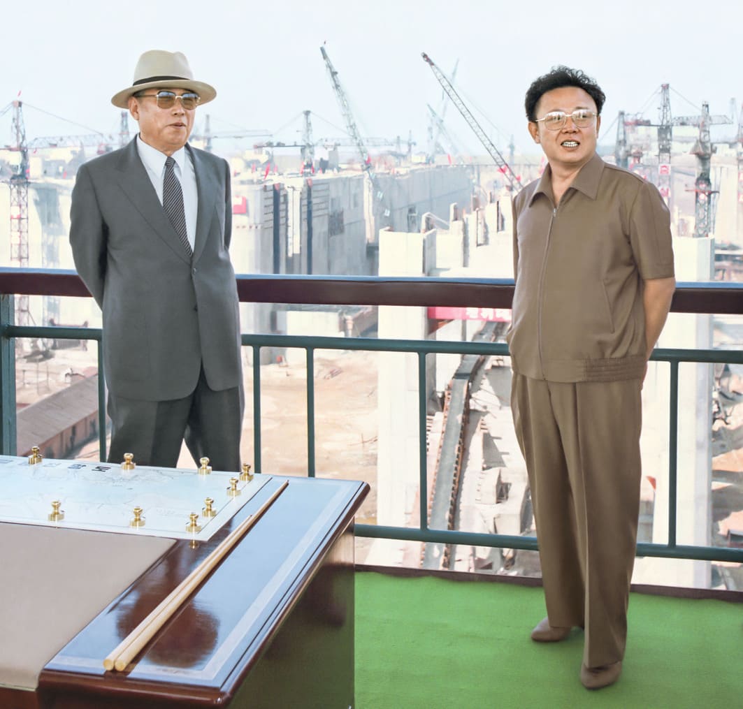 Ким Ир Сен и Ким Чен Ир на стройке Западноморского гидрокомплекса. Сентябрь 1985 года.