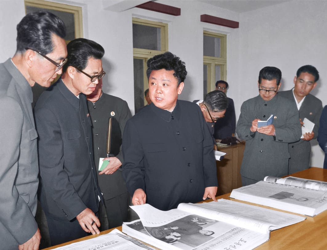 Ким Чен Ир руководит работой печатного органа ЦК ТПК «Нодон синмун». Апрель 1978 года.