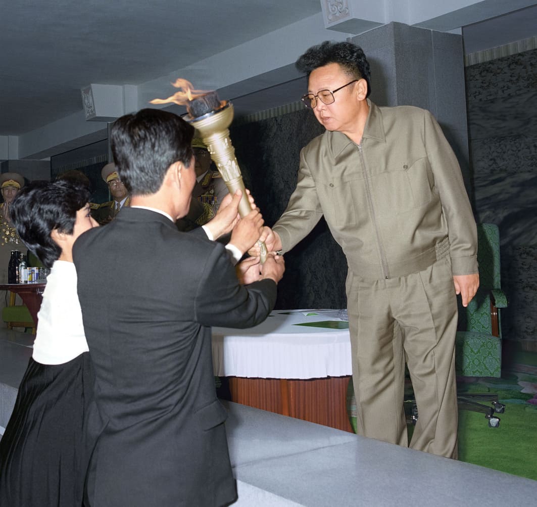 Ким Чен Ир передает представителям молодежи факел революции. Октябрь 1995 года.