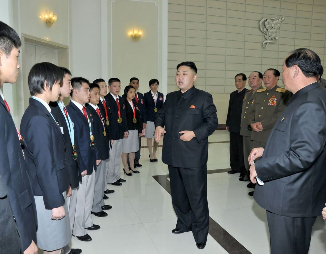 Ким Чен Ын со спортсменами, завоевавшими золотые медали на международных соревнованиях. Апрель 2013 года.