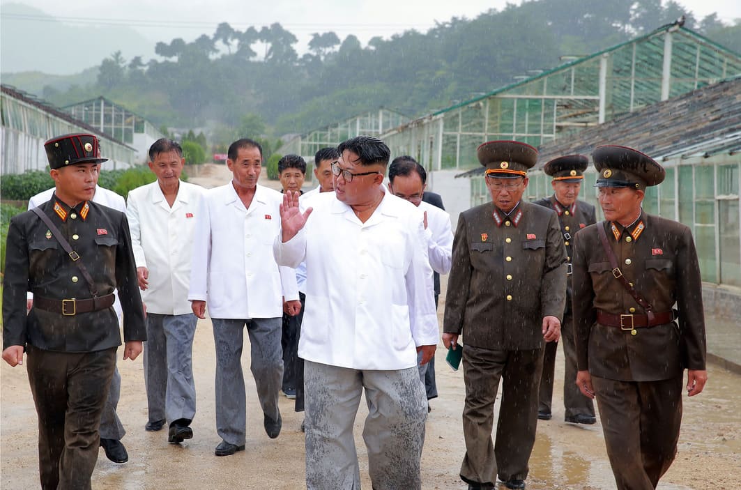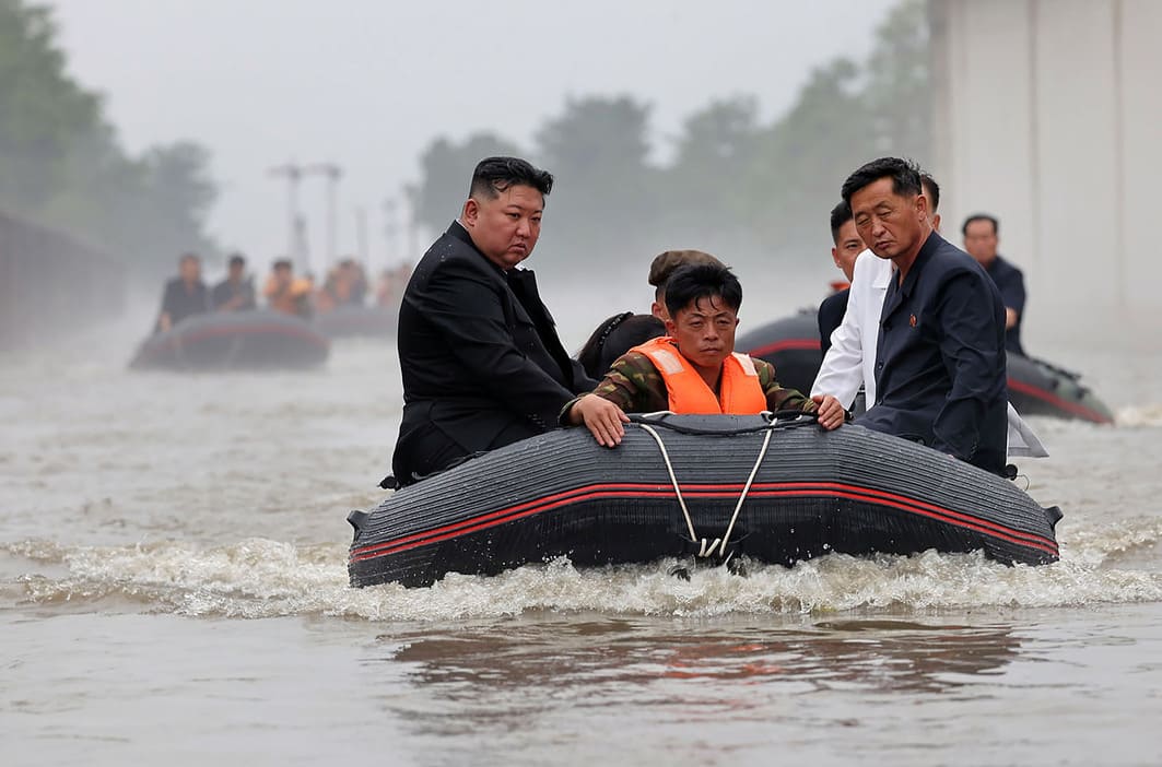 Ким Чен Ын осматривает затопленный район в городе Синичжу провинции Северный Пхёнъан. Июль 2024 года.