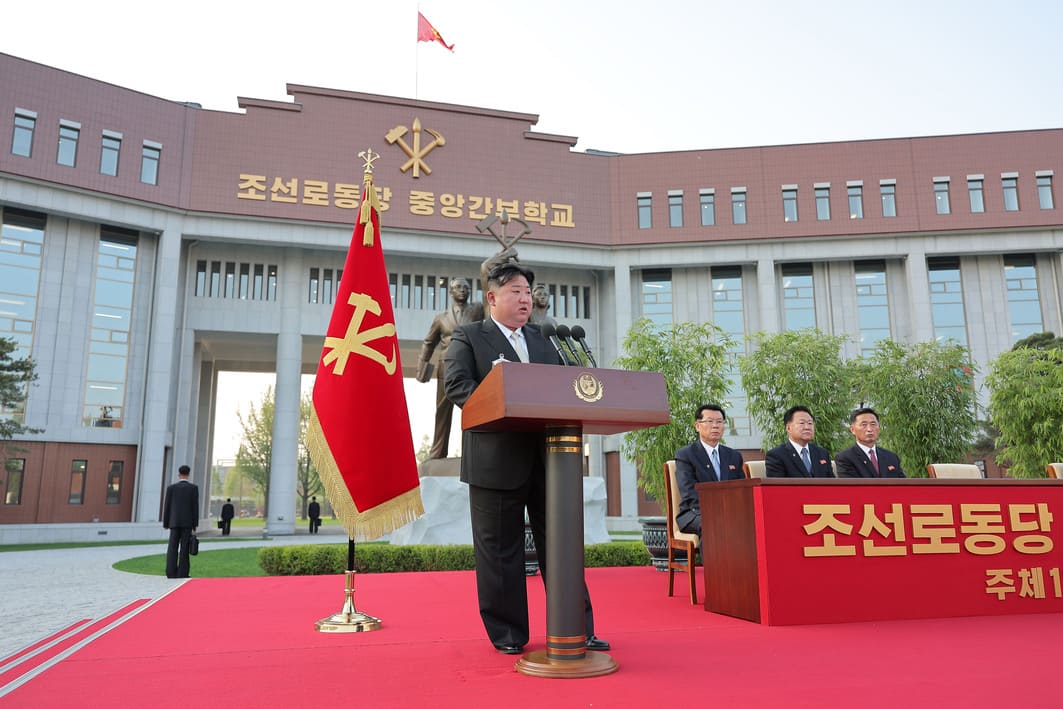 На церемонии завершения строительства Центральной школы по подготовке кадров ТПК Ким Чен Ын подчеркивает важность подготовки партийных кадров новой эпохи, преданных идеалу и духу основания партии. Май 2024 года.