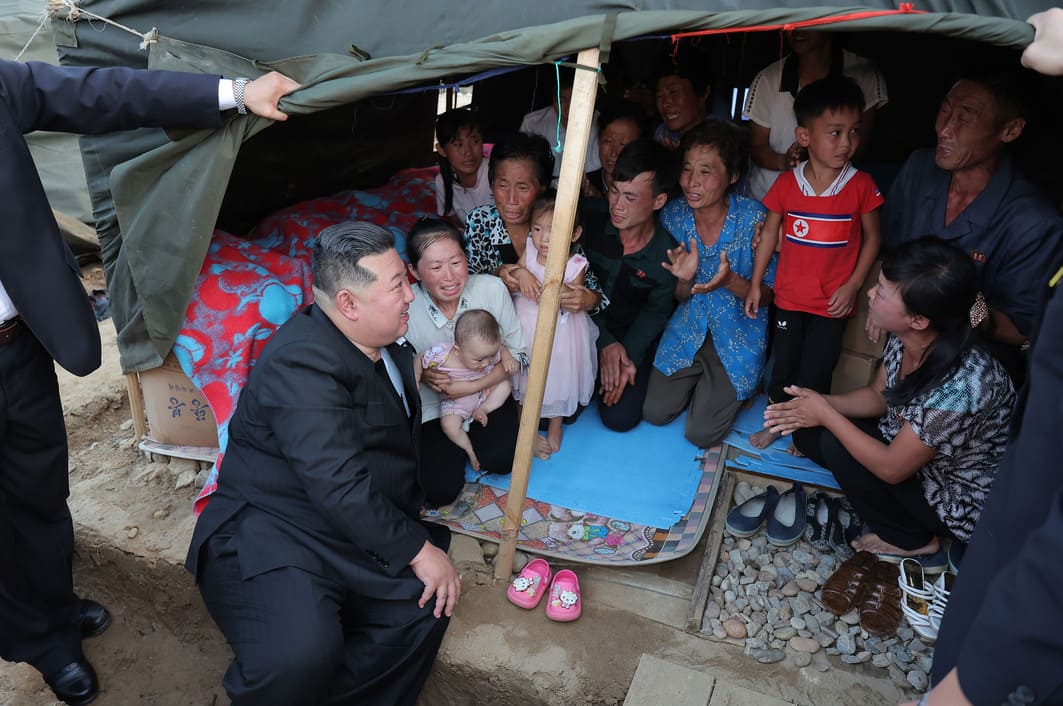 Ким Чен Ын посещает палатки, где временно находятся жители, пострадавшие от наводнения, и утешает их. Август 2024 года.
