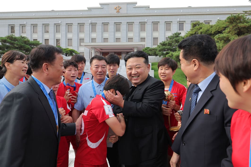 Ким Чен Ын со спортсменками и тренерами, завоевавшими «золото» на Чемпионате по футболу среди женщин до 20 лет ФИФА-2024. Сентябрь 2024 года.