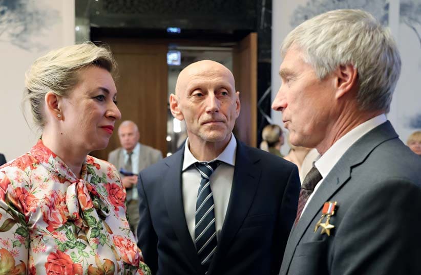 Директор ДИП МИД России Мария Захарова, генеральный продюсер документального фильма «Союз — Аполлон. Сила притяжения» Андрей Феофанов и лётчик-космонавт Сергей Крикалёв (слева направо) на специальном показе фильма в историческом кинотеатре «Художественный»
