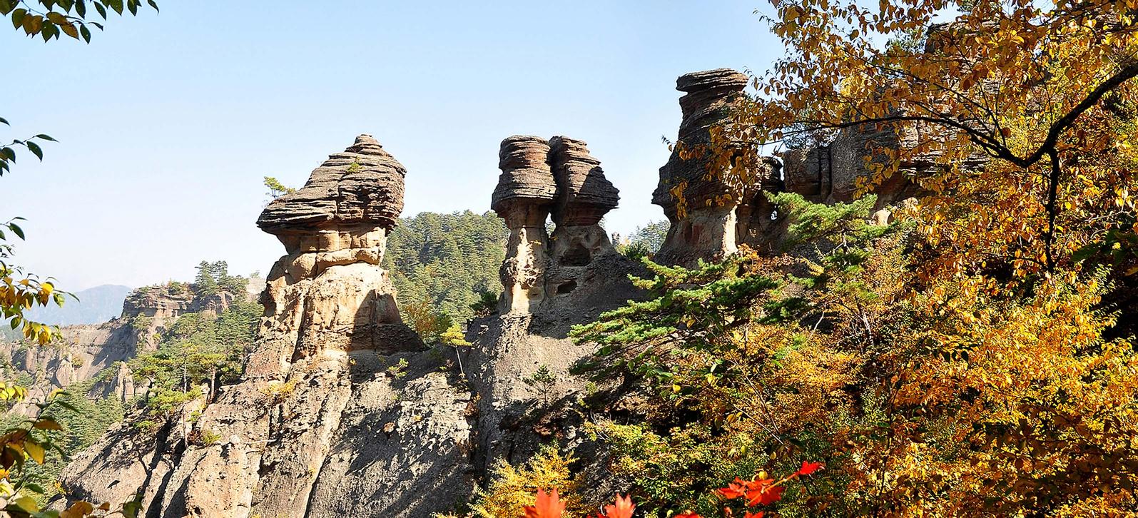 Горы Чхильбо, являющиеся одной из знаменитых гор КНДР, образуют необычный пейзаж из-за причудливых скал и утесов.