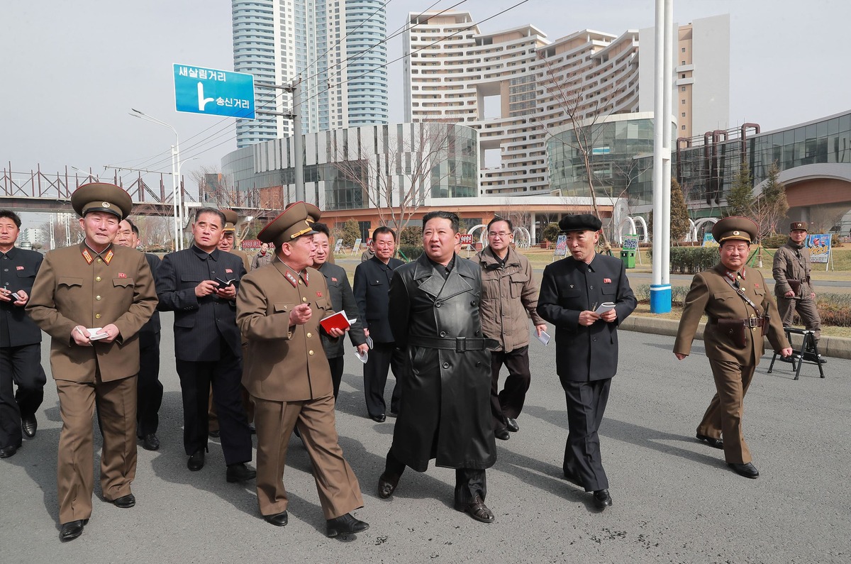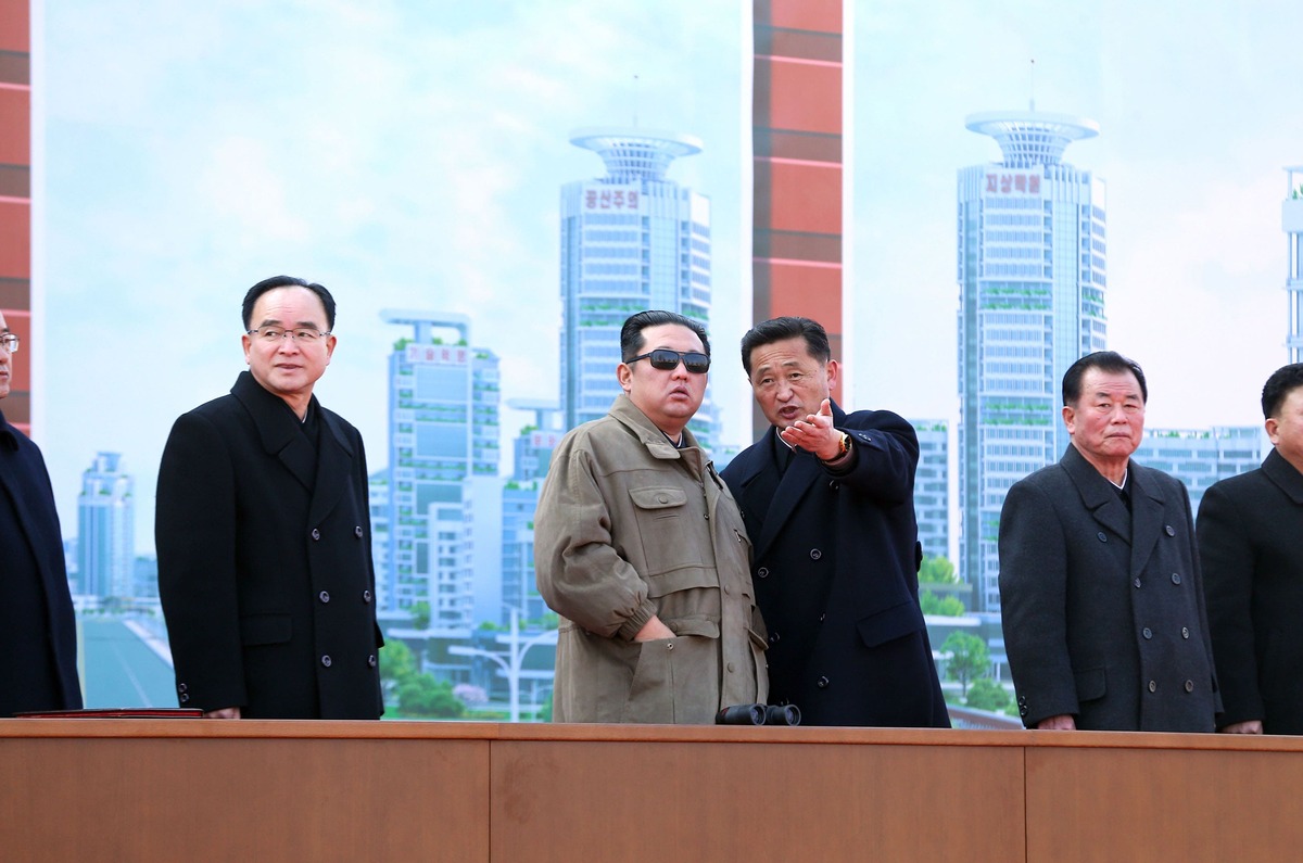 Уважаемый товарищ Ким Чен Ын на стройке жилых домов на 10 тыс. квартир в районе Хвасона в преддверии ввода в строй (третья очередь). Март 2025 года.