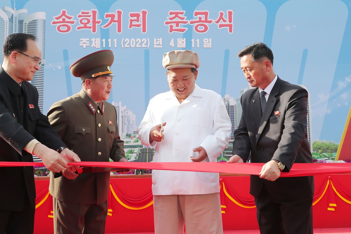 Уважаемый товарищ Ким Чен Ын разрезает ленту в честь завершения строительства улицы Сонхва. Апрель 2022 года.