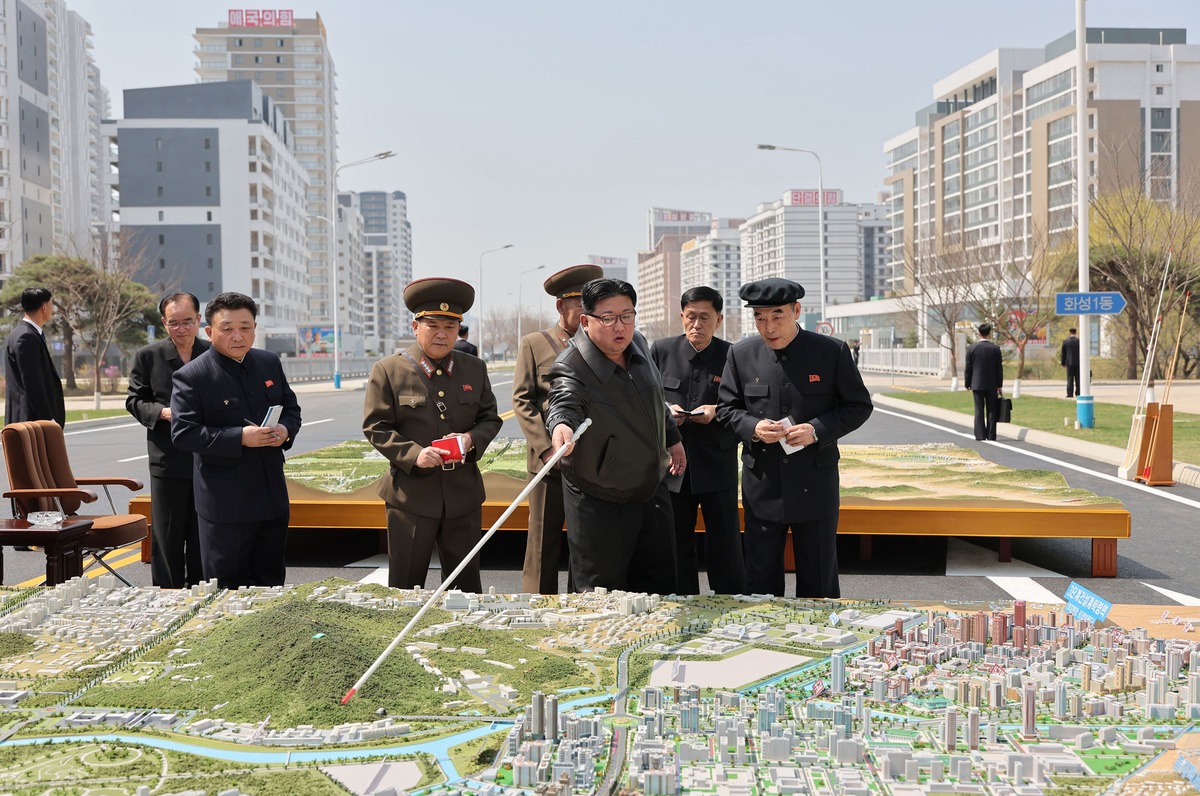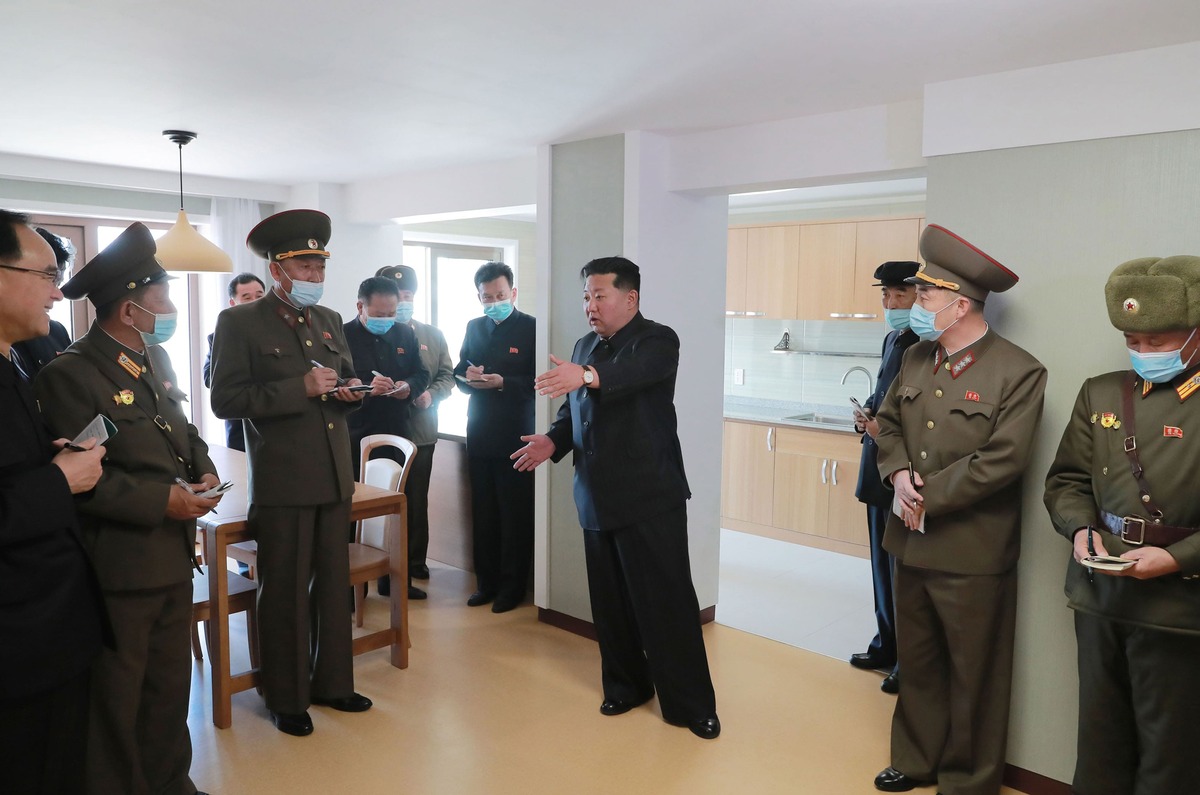 Уважаемый товарищ Ким Чен Ын осматривает террасный жилой сектор на набережной реки Потхон, построенный в квартале Кёнру. Апрель 2022 года.