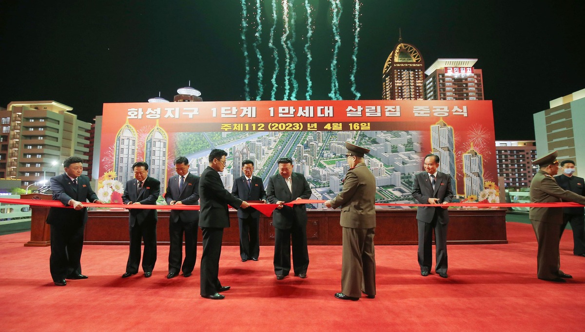 Уважаемый товарищ Ким Чен Ын на церемонии завершения строительства жилых домов на 10 тыс. квартир в районе Хвасона (первая очередь). Апрель 2023 года.