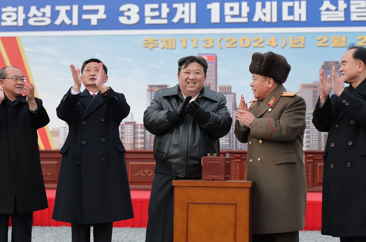 Уважаемый товарищ Ким Чен Ын на церемонии начала строительства жилых домов на 10 тыс. квартир в районе Хвасона (третья очередь). Февраль 2024 года.