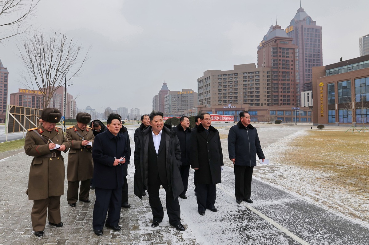 Уважаемый товарищ Ким Чен Ын на стройке жилых домов в районе Хвасона в преддверии ввода в строй (четвертая очередь). Январь 2026 года.