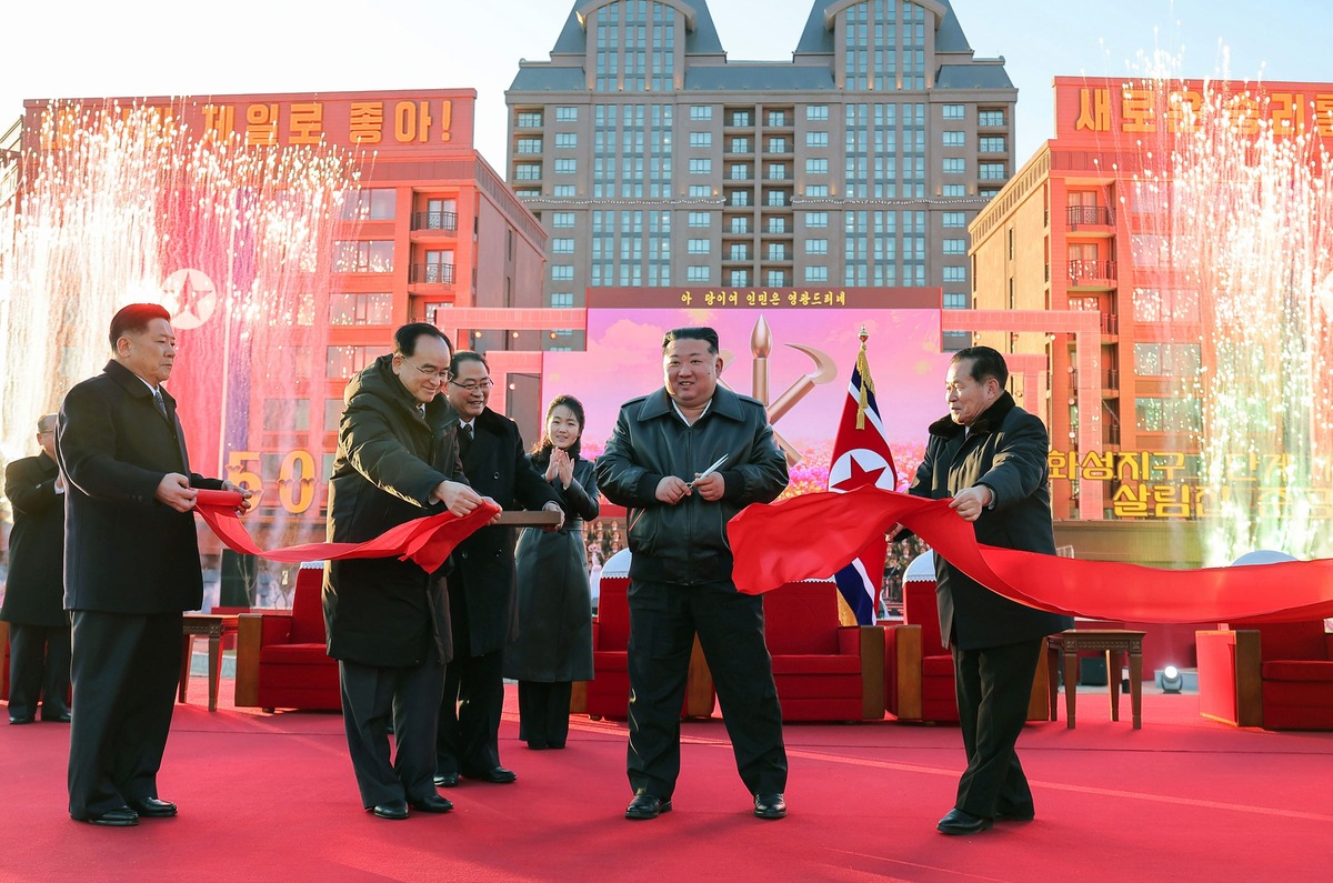 Уважаемый товарищ Ким Чен Ын разрезает ленту на церемонии завершения строительства улицы Сэбёр. Февраль 2026 года.
