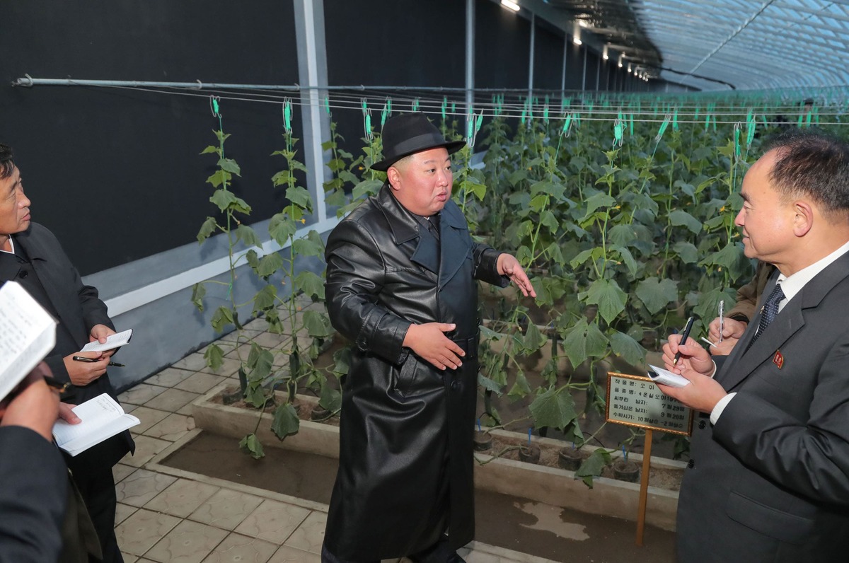 Уважаемый товарищ Ким Чен Ын в Рёнпхоском тепличном хозяйстве после ввода в строй. Октябрь 2022 года.