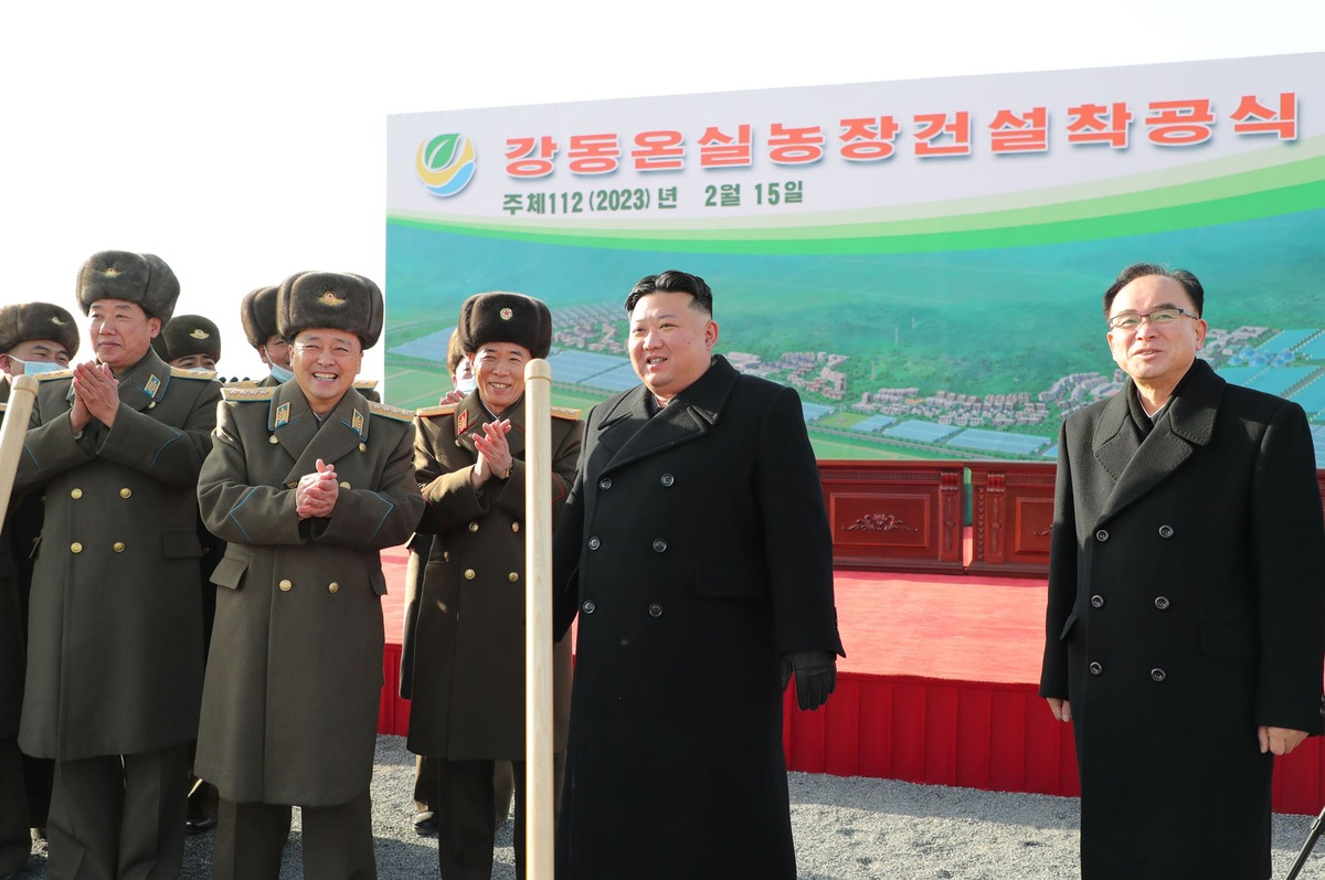 Уважаемый товарищ Ким Чен Ын на церемонии начала строительства Кандонского тепличного комбината. Февраль 2023 года.