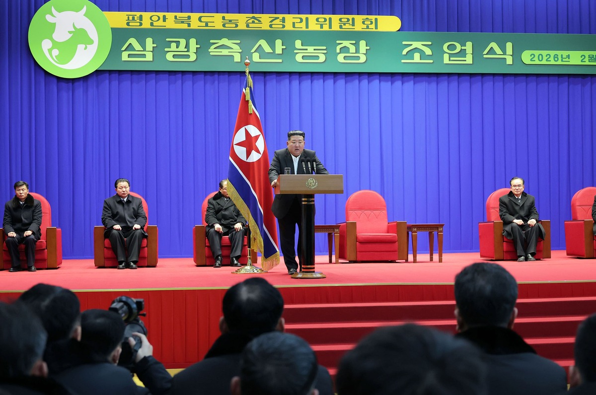 Уважаемый товарищ Ким Чен Ын на церемонии ввода в строй Самгванского животноводческого комплекса. Февраль 2026 года.