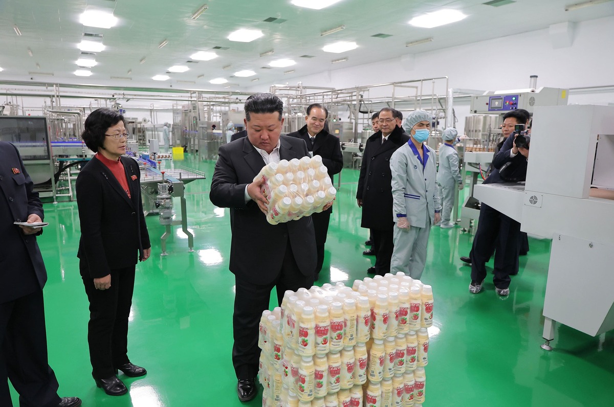 Уважаемый товарищ Ким Чен Ын ознакомляется с производством молочных изделий Самгванского животноводческого комплекса. Февраль 2026 года.