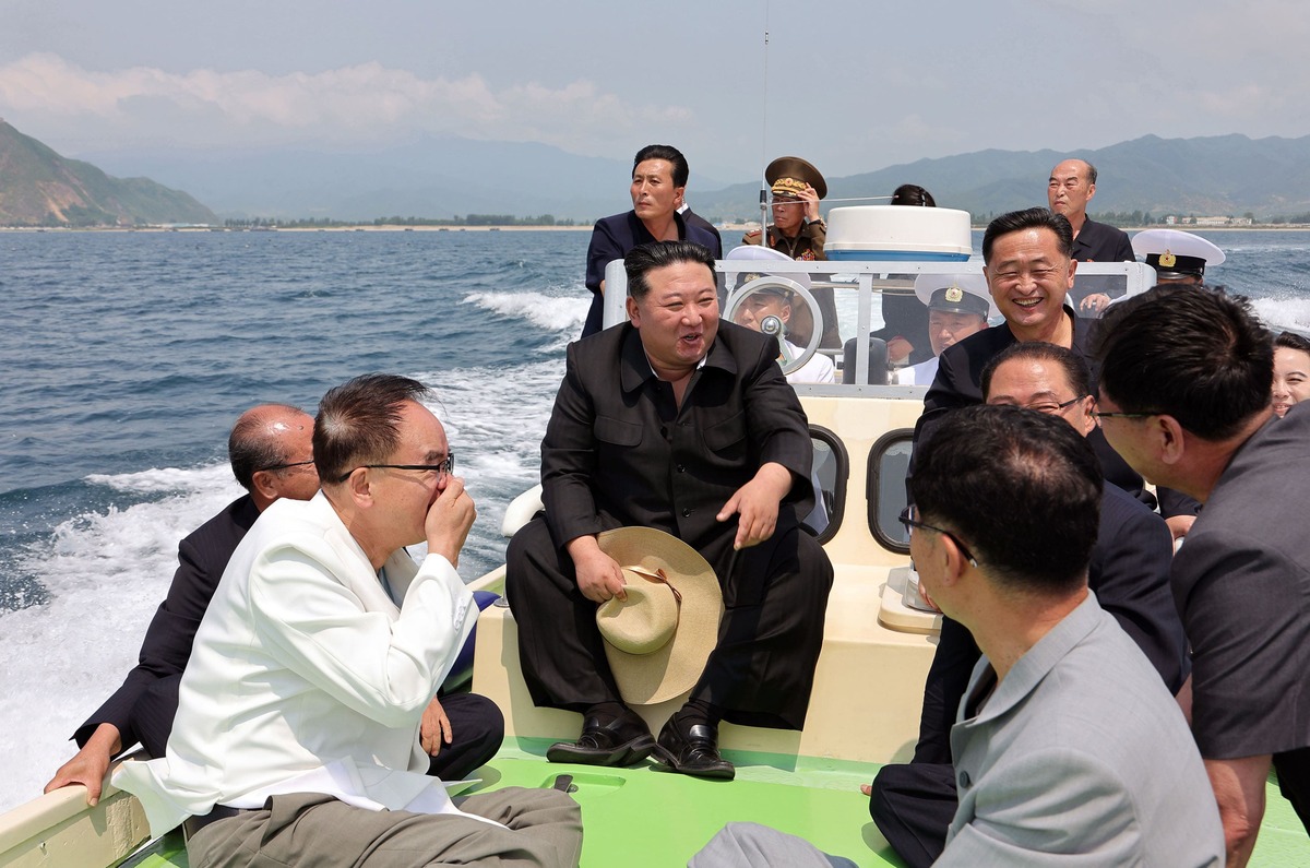 Уважаемый товарищ Ким Чен Ын осматривает акваторию Марикультурного хозяйства в городе Синпхо. Июль 2024 года.