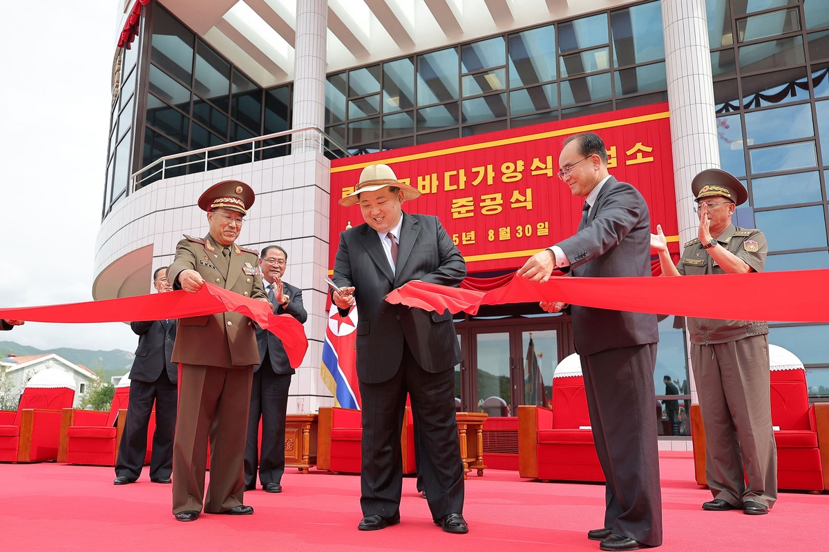 Уважаемый товарищ Ким Чен Ын на церемонии завершения строительства Марикультурного хозяйства в уезде Раквон. Август 2025 года.