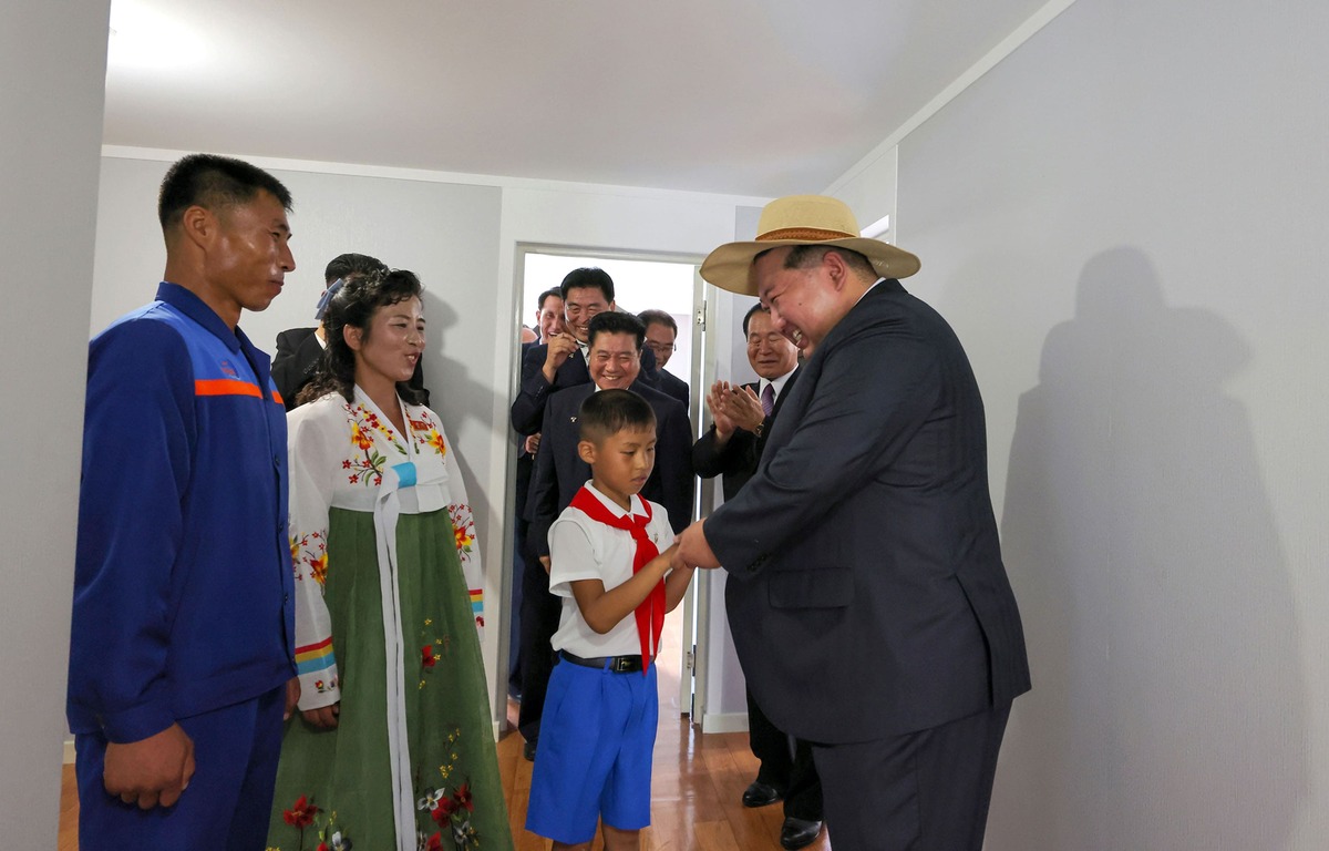 Уважаемый товарищ Ким Чен Ын посещает семью работника Марикультурного хозяйства в уезде Раквон, получившего новый дом. Август 2025 года.