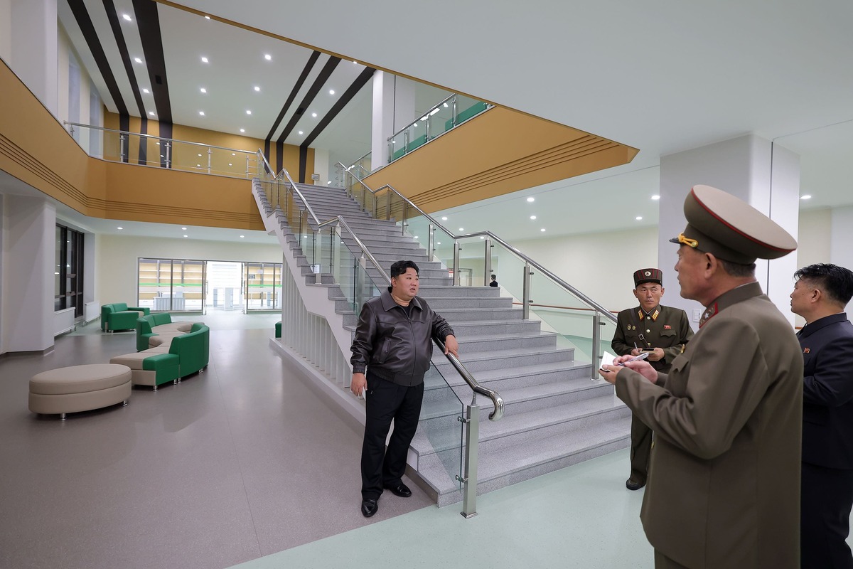 Уважаемый товарищ Ким Чен Ын осматривает Кандонскую уездную больницу в преддверии ввода в строй. Октябрь 2025 года.