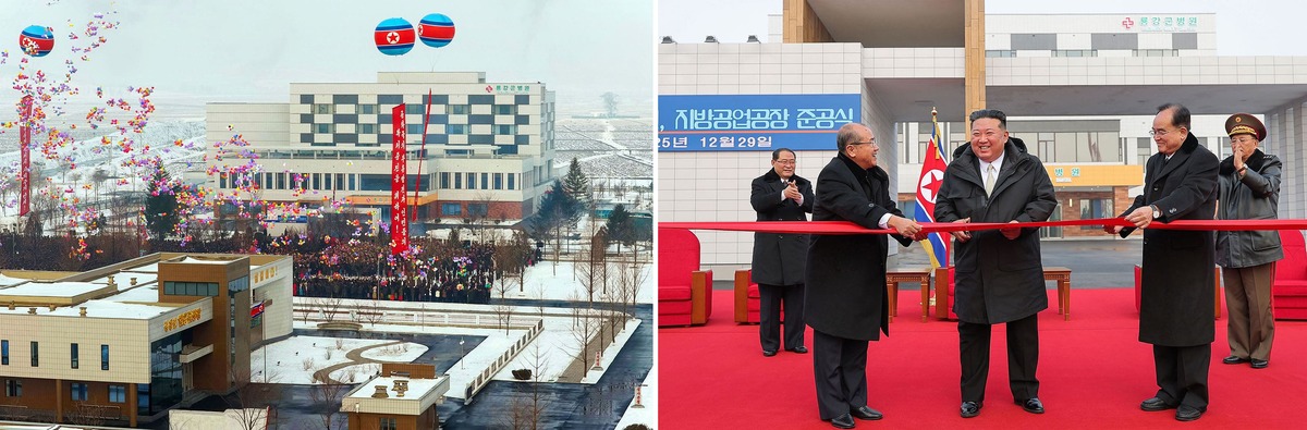 Уважаемый товарищ Ким Чен Ын на церемонии завершения строительства уездной больницы и предприятий местной промышленности в уезде Рёнган города Нампхо. Декабрь 2025 года.