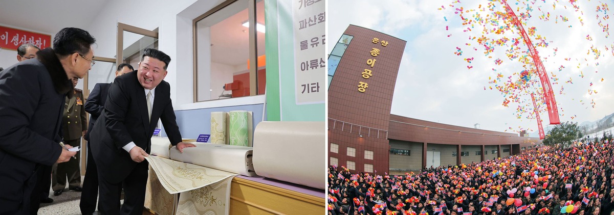 Уважаемый товарищ Ким Чен Ын на Ынсанской бумажной фабрике в провинции Южный Пхёнъан после ввода в строй. Декабрь 2025 года.