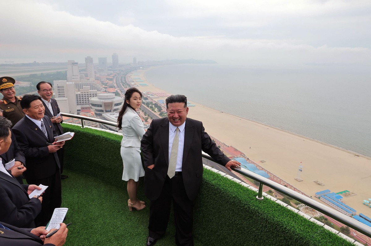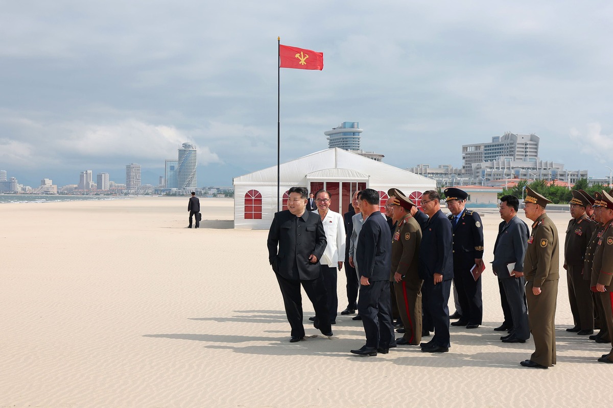 Уважаемый товарищ Ким Чен Ын осматривает Вонсан-Кальмаскую прибрежную туристическую зону после ввода в строй. Июнь 2025 года.