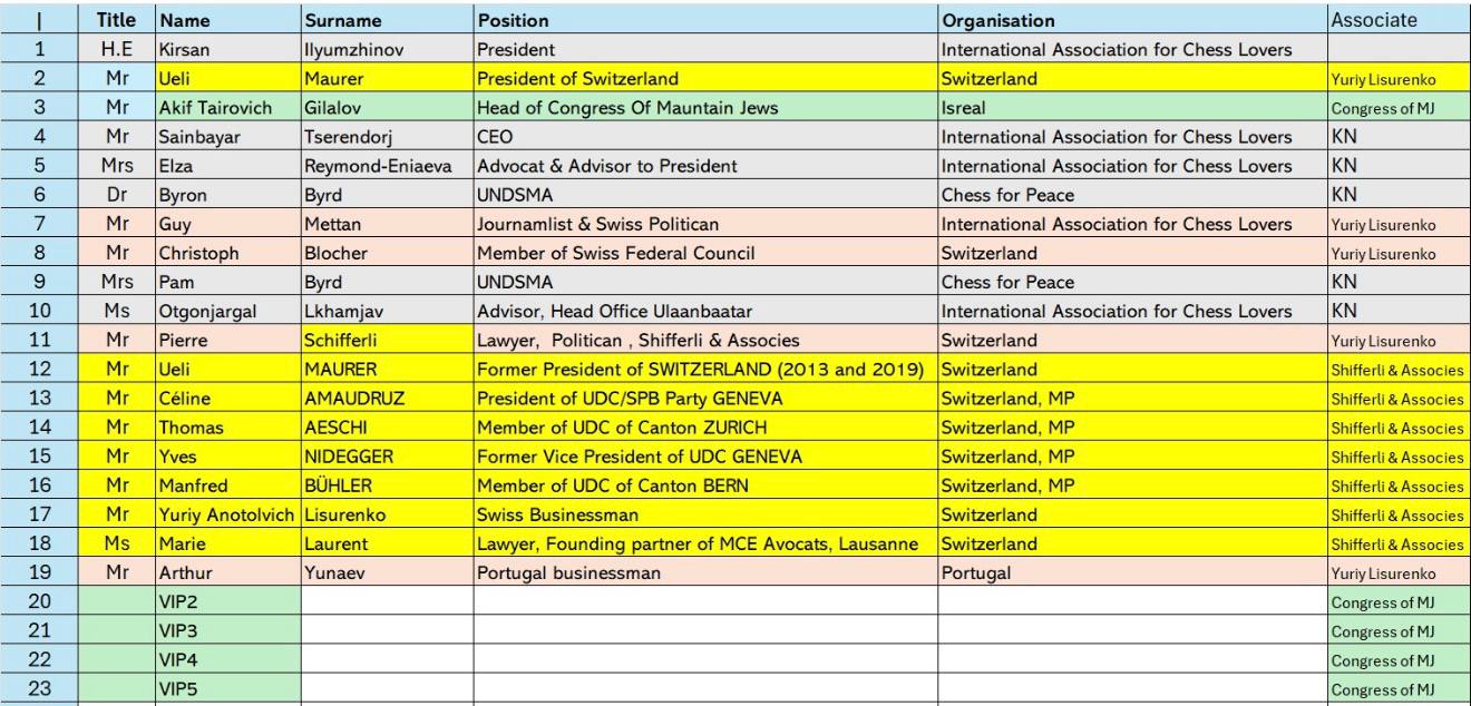 В распоряжении нашей редакции оказался рабочий лист участников (Agenda of the Day), который проливает свет на состав делегации. Список гостей впечатляет разнообразием: от швейцарских политиков тяжелого веса до представителей общин горских евреев и известных шахматных функционеров.