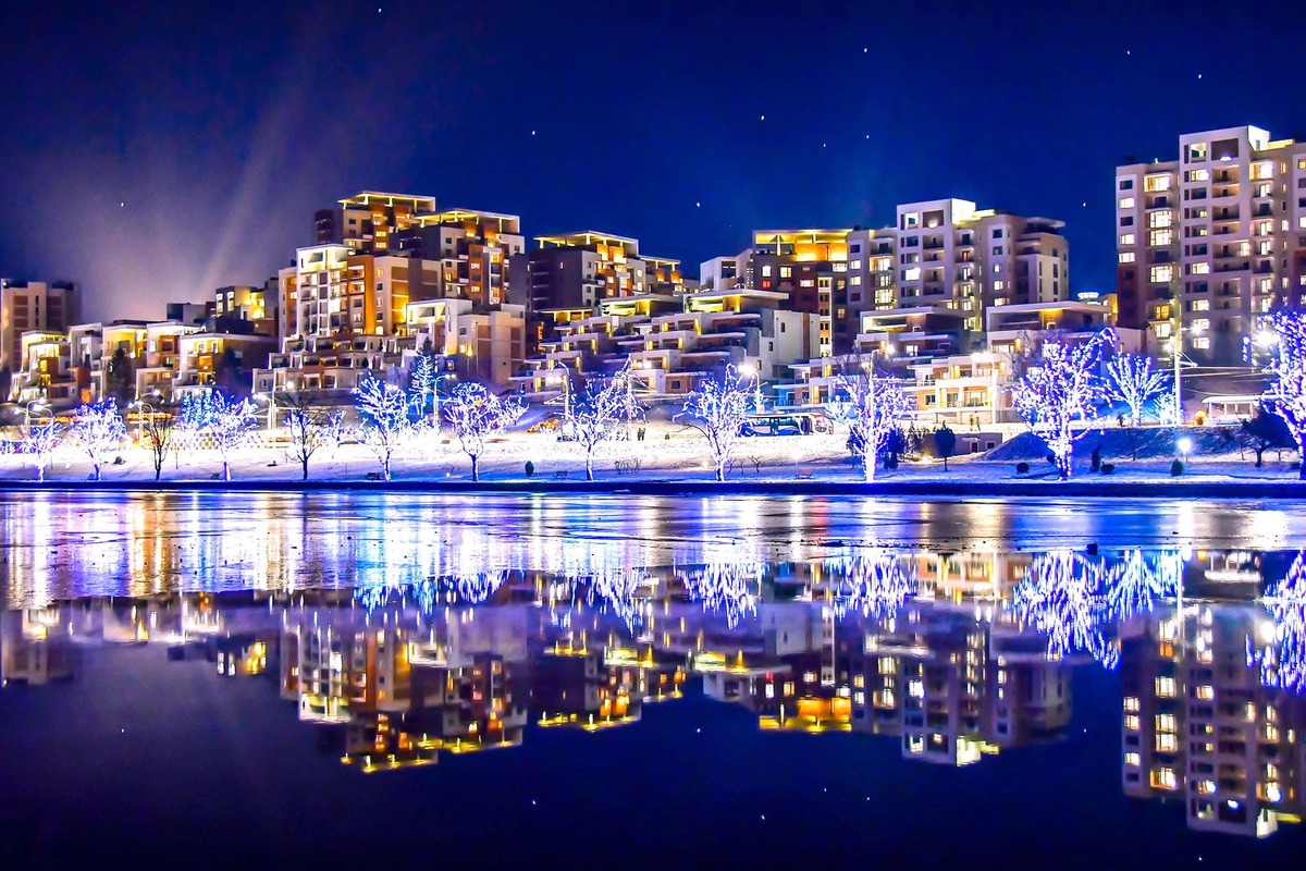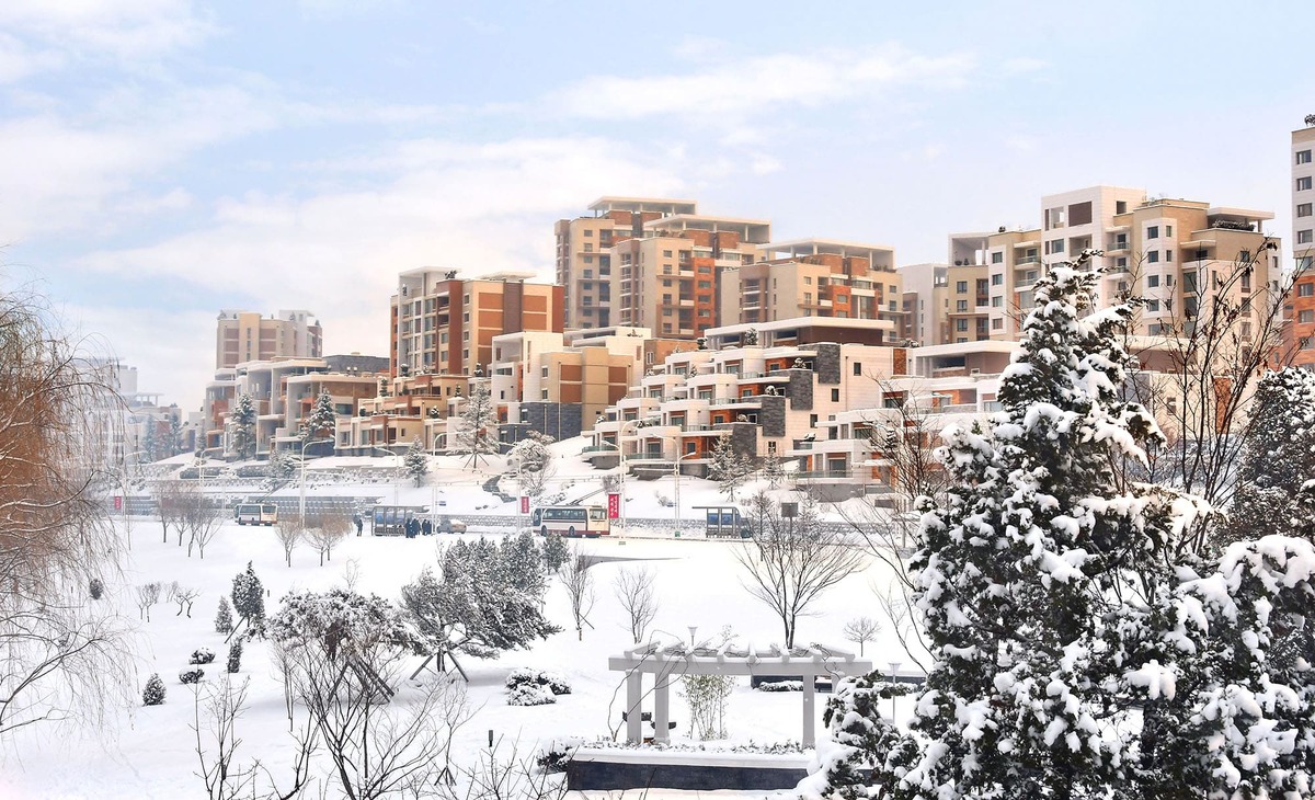 Это красивый снежный пейзаж в террасном жилом секторе на набережной реки Потхон в столице КНДР Пхеньяне. Сектор называется кварталом Кёнру оттого, что он прекрасен, как бисерная беседка.