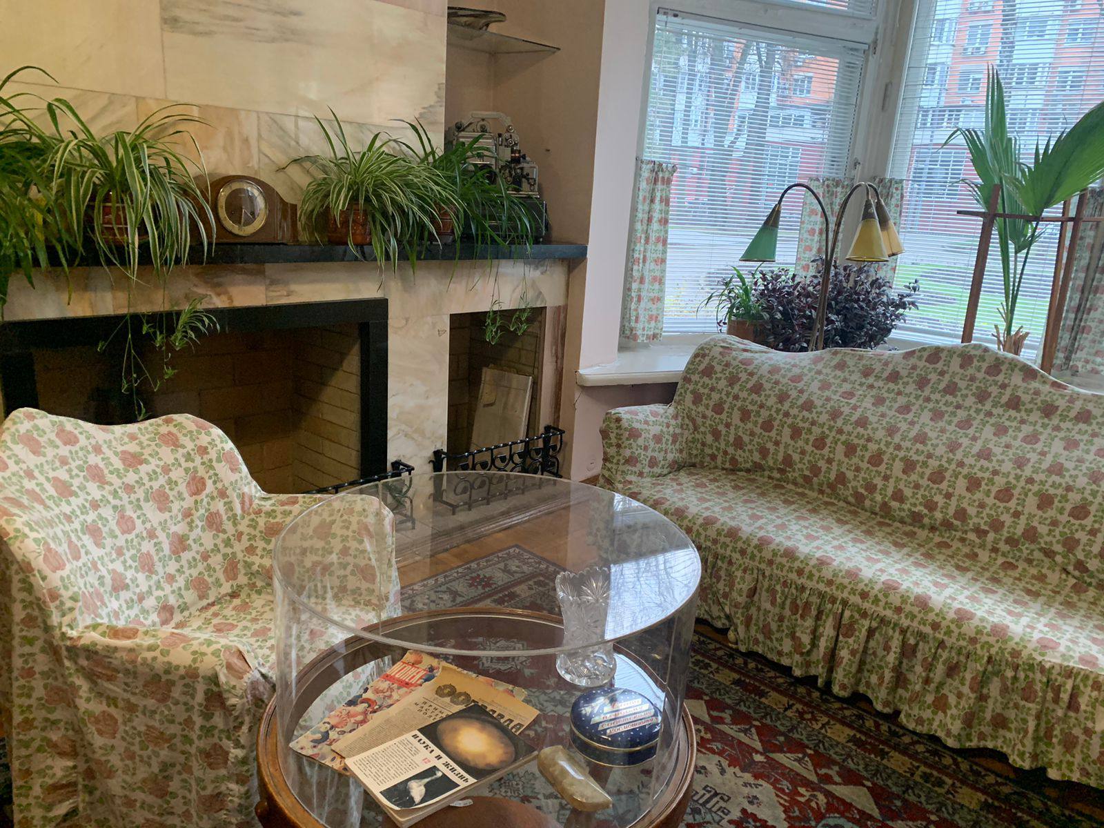 Гостиную украшает отделанный розовым мрамором камин. К сожалению, он не функционален. Его пытались разжечь только раз: из-за конструктивной ошибки сложившего его «мастера» дым повалил в комнату и закоптил обрамляющий мраморный декор, след чего виден и сейчас. Сергей Павлович собирался сам исправить устройство камина, но из-за постоянной занятости не успел этим заняться. На журнальном столике и сейчас лежит пресса, которую конструктор читал в последний уютный вечер дома, среди трёх изданий – газета «Правда» за 4 января 1966 года.